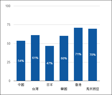 圖 1:調查亞太區域各國用戶出門必帶智慧型手機,以台灣(81%)奪冠。