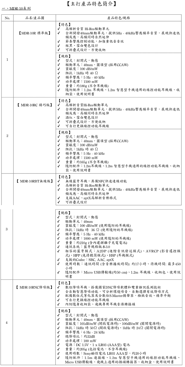 【MDR-10】系列沿襲 MDR-1 的原音重現、簡約外型和配戴舒適三大元素,再加上「時尚配色」和「輕量化」的特點,推出標準版 MDR-10R 、精巧可摺疊的 MDR-10RC 、藍牙無線功能的 MDR-10RBT 和具備降噪功能的 MDR-10RNC 。
