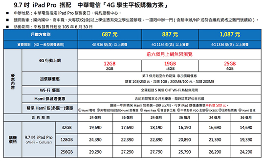 電信業者陸續宣布 Apple iPad Pro 9.7 吋在台灣開賣,為了讓讀者可以更便於選購出自己喜歡的方案,在此整理了各大業者資費。