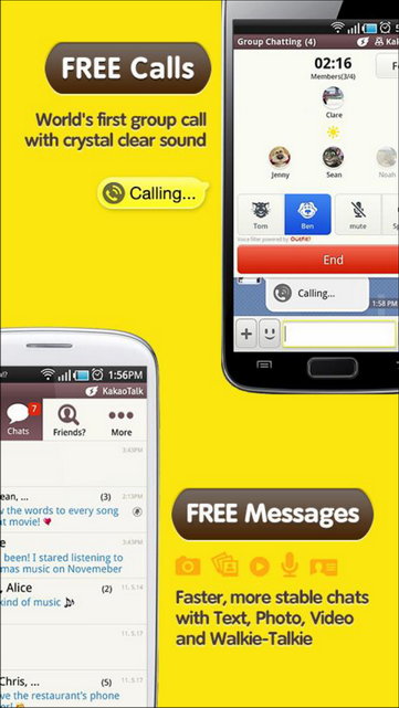 KakaoTalk 有基本的文字訊息功能、表情符號,除了靜態的表情圖案外,特別的是還有超過 250 個可愛的動態表情貼圖,支援 12 種不同語言,包括中文、日文、泰文等,另外還有和 LINE 一樣的免費通話,可以加入 3-5 個好友一同「群組通話」,想要閒話家常就更方便囉!